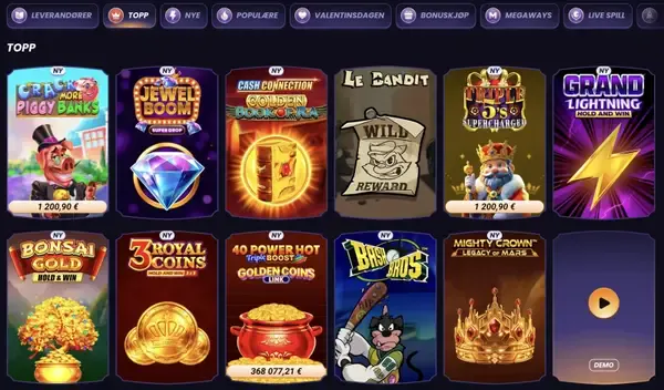 Lobbyen vÄr er bygget for Ä hjelpe deg Ä finne riktig tittel raskt, selv med en stor katalog. Funbet Casino har rundt 17 000 spill fordelt pÄ Spilleautomater, Live Casino, Bordspill, Jackpots, Crash-spill og en Sportsbook-seksjon som er lett Ä nÄ fra hovedmenyen. Spilleautomater er hovedkategorien, men vi holder ogsÄ en sterk miks av klassikere og moderne formater for ulike risikonivÄer og spilltempo. Gjennomsnittlig RTP er omtrent 96%, men det varierer etter spill og leverandÞr, sÄ vi anbefaler Ä sjekke informasjonspanelet inne i hver tittel.